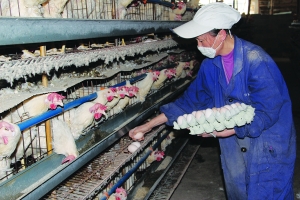 11月21日,龙山县石羔镇正南村羽丰养鸡合作社的工作人员正收集当天的鸡蛋。该合作社自2009年11月成立以来,积极引进新品种、新技术,现已养良种鸡12万羽,成为湘鄂渝边区规模最大的养鸡场。带动了周边群众走上发家致富的康庄大道。