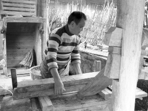 永顺县勺哈乡洞坎村村民黄元兴正在为做好的纸板加压脱水。一担草纸两捆,批发给县城的零售商能卖到60元一担,忙时务农,闲时做草纸,这样半农半工,生产草纸一年挣个2万多元,黄元兴告诉笔者。他说过去村里家家户户都搞这个副业,现在年轻人出去打工的多了,他们这个草纸专业村如今也只有二三十户人家生产草纸了。 吴晓敏 摄