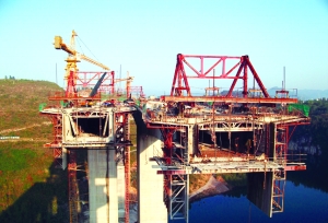 11月23日,张花高速花垣河大桥的建设者们正在加紧进行大桥上部结构高空架设。该桥全长625.44米,大桥主跨145米,桥面宽度24.5米,最大墩高100米,横跨花垣、保靖两县,是张花高速花垣段与保靖段的控制性工程。 潘尚德 摄