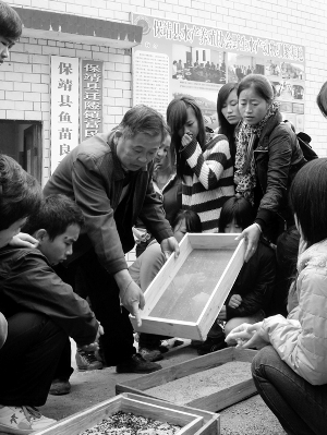 11月24日,保靖县水产养殖协会会长向世荣在迁陵镇苏家坪鱼苗鱼种繁殖场给该县职业中专养殖专业师生讲解鱼料———黄粉虫的养殖与用途。向世荣1998年开始从事水产养殖,积累了丰富的养殖经验,现各种鱼类养殖规模已达50000多尾,年销售收入20余万元,纯收入8万余元,带动了周边10多个乡镇245户农民从事水产养殖致富。张文华 摄