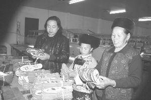 保靖县水田河镇水田河村34岁的苗族青年黄向杨,为了传承濒临失传的苗族刺绣工艺,2011年初返乡投资80余万元在水田河村建起了“苗家苗姑刺绣专业合作社”,采取传统工艺与现代工艺相结合,精心制作绣有“苗家对歌”、“椎牛”图案鞋垫,产品供不应求,解决30余名农村劳动力就业。图为11月27日黄向杨(左一)在检查产品质量。