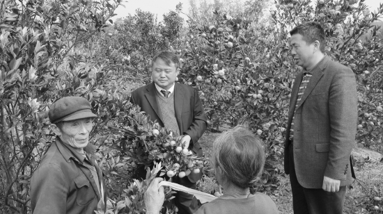 吉首市农村信用合作联社马颈坳信用社主任符安定,20多年来扎根基层,奉献信合,服务“三农”,在平凡的岗位上做出了不平凡的业绩。近日,被中国银监会、中国银行业协会评为“支农先进个人”。图为符安定(左二)在果园里询问柑橘收成。 杨丽琼 摄