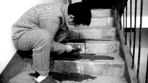 吉首市乾州新区的一些楼栋里面,“牛皮癣”也开始滋生,市民对此反映强烈。图为一市民正在铲除楼道里新贴的广告条。
