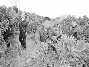 花垣县深入开展窗口单位和服务行业“为民服务创先争优活动”,鼓励党员干部走进田间地头参加劳动。图为12月11日,该县农业局党员干部胸戴党徽进边城镇搞和村柑橘园,帮助和指导果农剪枝。 张耀成 摄