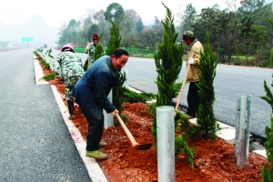 12月18日,吉茶高速花垣县道二乡者仁村路段,建设工人正在栽种隔离带绿化树。时下,吉茶高速全面进入植树绿化阶段,绿化工程将于明年3月底结束。