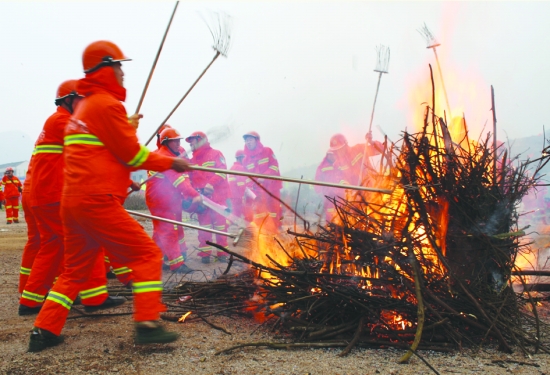 12月20日,湘渝黔边区的我州花垣县、重庆秀山县、贵州松桃县,联合在交界处的一座荒山上举行民兵森林防火实战演练,演习内容包括火情报告、预案启动、战术应用、联合灭火、排查余火等,150余人参加演习。图为演练现场。 龙群峰 曹建军 摄