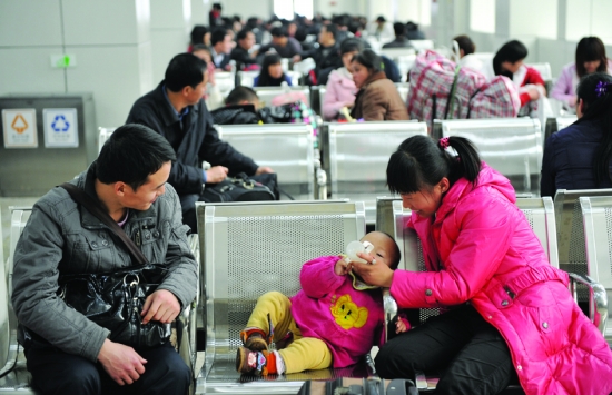 1月8日,吴增涛(前左一)一家三口在广州火车站候车。当日,一年一度的春运开始,在今后的40天里,将累计有31.58亿人次乘坐各种交通工具出行。春节之前,许多人从上学和工作的城市,千里迢迢,回到家乡与亲人团聚,全家人吃上一顿年夜饭。祝福他们一路旅途平安。 新华社记者 卢汉欣 摄