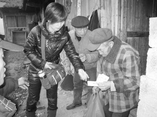1月13日,永顺县猛管处、商务局、国税局、财保公司及人保公司5家单位,来到该县回龙乡建整扶贫村羊毛村,走访看望贫困户,送去慰问金6500元,国税局干部刘莹自掏腰包给15户贫困户送去50多公斤年肉。 刘文化 杨 勇 摄
