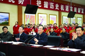 宽大的屏幕上,大庆油田、塔里木油田、兰州石化、中石油苏丹尼罗河公司和长庆油田安塞女子采油队的干部职工通过视频向温家宝汇报了各自情况,并向总理拜年,祝福祖国繁荣昌盛,更加富强。温家宝边听边记,不时点头,并一一回应。