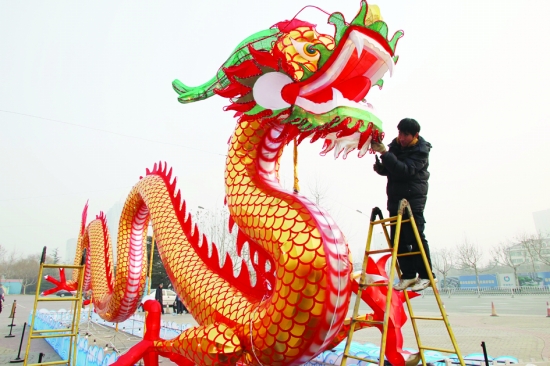 龙的传人迎龙年。这是1月15日,在山东潍坊,工作人员在为“双龙戏珠”大型灯饰景观安装灯串。 新华社发(孙树宝 摄)