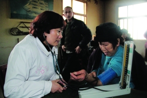 2月5日,泸溪县人民医院组织10余名医护人员,带着肉、饺子等食品,来到浦市镇敬老院,与该院的老人们一起迎元宵节。图为医护人员在为老人量血压。 李焱华 王金玉 摄