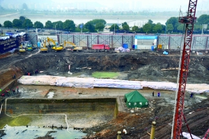 长沙万达公馆施工现场被彩条布包裹的古城墙(2月17日摄)。