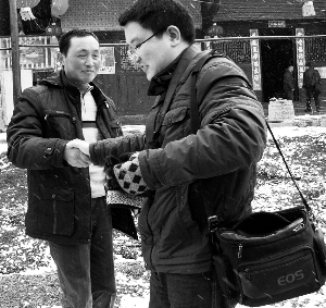 2月18日,龙山县石牌镇桃兴村获得龙山县“新型农民标兵”荣誉称号的农民刘大印(左),受到记者采访。三年来,刘大印在信用社的大力支持下,仅种烤烟一项收入每年就达13万元,成为当地农民科技致富的带头人,受到新闻媒体的广泛关注,他创办的“大印农庄”也成为该县农民教育的学习基地。
