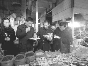 为了让群众放心购买物品,古丈县工商局执法人员深入一线开展打击假冒、仿冒行动。图为3月6日,该县城关工商执法人员与某食品公司打假人员在古丈县民族大市场内进行检查。