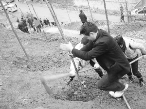3月8日,州委办系统87名干部在建整扶贫村———泸溪县达岚镇都用村,参加义务植树劳动。当天下午,该办干部同当地镇、村干部在村小周围的空地上挖坑栽树,深受当地群众称赞。图为植树场景。 吴代清 摄