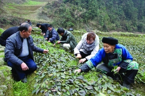 3月14日,保靖县电视台驻葫芦镇傍海村工作组的同志们,帮该村石清贵扯茶苗杂草。该县3月12日组织203个工作组、1000余名干部,分别进驻该县203个村和社区,与广大农民群众同吃同住同劳动,并联系一户帮扶对象。下基层,心连心,深受群众欢迎。 张承印 黄益民 摄