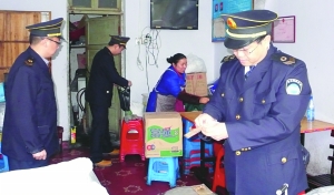 为确保中小学生饮食安全, 3月8日至12日,泸溪县食品药品监督管理局组织执法人员,集中对白沙城区学校周边餐饮服务单位、托幼机构食堂,开展集中整治行动。共检查34家餐饮单位和7家托幼机构食堂,对无证经营的5家餐饮单位和1家托幼机构食堂依法给予停业处理。图为3月12日,该县食药局执法人员在检查。