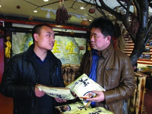 风凰县廖家桥镇樱桃村周祖辉,2007年在该县建行的帮助下投资680万元,挖掘和传承土家擂茶,上市后供不应求。图为3月18日周祖辉(左)与该县民族贸易协会会长龙云超(右)共谋产业发展大计。
