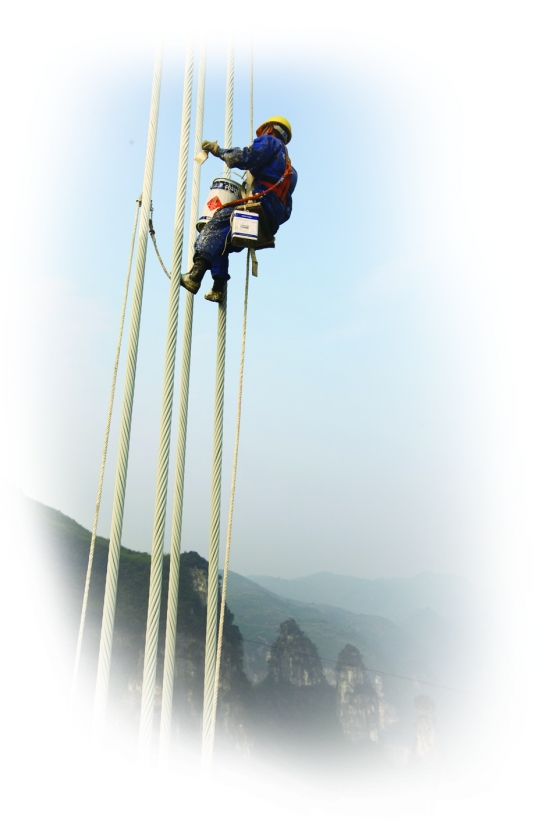 2011年11月24日,吉首市矮寨镇,“蜘蛛侠”正在为大桥进行涂装防护。