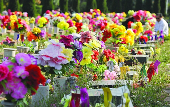 4月2日,在昆明金宝山公墓,市民用鲜花和绢花祭奠亲人。 清明节小长假期间,昆明市民纷纷来到市郊的各大公墓祭扫。很多人采用敬献鲜花和绢花等方式代替焚香、点烛和烧纸钱等传统形式祭奠先人,寄托哀思。 新华社记者 蔺以光 摄