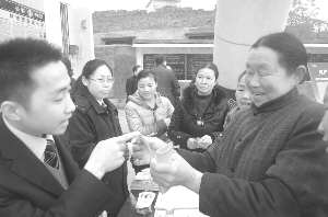 入春以来,龙山县农村信用联社积极组织员工深入乡镇农村,开展送科技、送资金、送信息“三送”活动,支持春耕生产。图为4月1日,该联社员工在新城街道办事处油菜坪村开展“三送”活动时,向群众讲解假币识别方法。