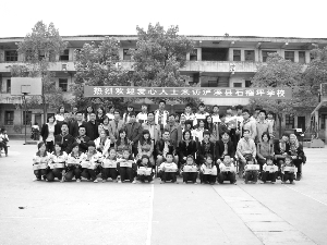 4月7日,上海扶轮青年社代表、武汉各大学学生代表、湘钢梅塞尔公司员工代表等一行来到泸溪县石榴坪乡中心学校开展献爱心活动,为这些贫困留守学生送来了高筒鞋、童鞋共215双、衣物2000余件。捐助活动结束后,爱心人士来到贫困学生家里进行家访并送上善款。图为爱心人士代表与贫困留守学生合影。