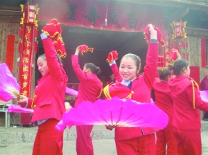 永顺县松柏镇心管艺术团成立近10年,该团演员不断创新,从单一管乐发展成为集小品、舞蹈、演唱于一体的综合性艺术团。目前,共有演员15人,年演出达120余场(次),深得当地及周边乡镇百姓的青睐。图为该团演员在一农家表演舞蹈。 向 号 徐生友 摄