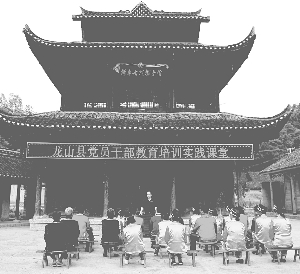 4月26日,龙山县委组织部干部在该县苗儿滩镇捞车村土家摆手堂前开展党员干部培训工作,与该村党员干部群众一道,共同展望民族特色旅游产业的美好前景。