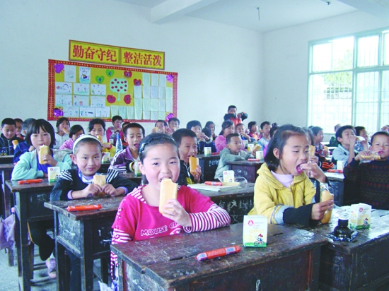 永顺县正式启动农村义务教育阶段学生营养改善计划。全县192所学校的46071名学生,将免费享受人均每天3元的营养餐。图为6月4日中午,该县毛坝乡九年制学校小学三年级学生正在吃免费营养餐。 吴 华 摄