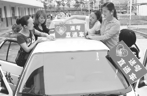 6月6日,龙山县湘安驾校一群高考服务志愿者正在给准备免费接送高考考生的车辆贴“送考直通车”标识。连日来,该县为确保全县3003名高考考生能圆满完成高考,调运40余台车辆成立高考接送车辆服务队,已准备好免费为考生提供乘车服务。