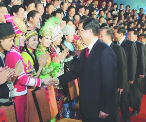 新华社北京6月12日电(记者 张宗堂 李 菲)歌声嘹亮,礼赞共同幸福生活;舞步欢畅,抒发团结奋斗豪情。第四届全国少数民族文艺会演12日晚在国家体育馆隆重开幕。党和国家领导人胡锦涛、温家宝、贾庆林、李长春出席观看开幕式文艺晚会。 国家体育馆灯火辉煌,洋溢着热烈喜庆的气氛。演出开始前,胡锦涛等党和国家领导人亲切会见了演职人员代表。这些代表中,有深受群众喜爱的著名少数民族艺术家,有来自少数民族地区的民间歌舞艺术家,还有来自香港、澳门和台湾地区的少数民族文艺界人士。胡锦涛等来到身着鲜艳民族服装的演职人员代表中间,同他们亲切握手、热情交谈。胡锦涛勉励大家坚持唱响民族团结进步的主旋律,为繁荣发展少数民族文艺事业作出新的更大贡献。 20时许,绚丽多姿的舞蹈《凤舞蝶飞》拉开开幕式文艺晚会《盛世中华》的帷幕。整台晚会由“天歌云舞”、“锦绣家园”、“吉祥神韵”3个篇章组成,少数民族演员满怀激情载歌载舞,展示了各民族文化艺术百花齐放的蓬勃活力。群舞《山谷木屐》、组舞《节日欢歌》、儿童歌舞《五彩传说》、原生态独唱《山歌》、琵琶歌《大家来把老人敬》、杂技《边寨鱼水情》……一个个富有民族韵味的节目明快奔放、异彩纷呈,形象表达了少数民族同胞热爱家乡、热爱祖国的真挚情感,生动反映了党的十七大以来各民族共同团结奋斗、共同繁荣发展的喜人景象,充分展现了各族儿女在以胡锦涛同志为总书记的党中央坚强领导下携手开创更加美好未来的雄心壮志。最后,藏族、维吾尔族、回族、壮族、蒙古族演员一同唱起歌曲《我们共同的家》,各族演员伴随着激扬的旋律尽情欢舞,把晚会推向了高潮。胡锦涛等党和国家领导人专注地观看演出,不时与全场观众一起,为演员们精彩的表演热烈鼓掌。 出席观看晚会的领导同志还有:回良玉、刘淇、刘云山、刘延东、李源潮、乌云其木格、司马义·铁力瓦尔地、马凯、杜青林、白立忱、阿不来提·阿不都热西提、李兆焯和布赫、热地。 第四届全国少数民族文艺会演由国家民委、文化部、广电总局和北京市人民政府联合主办。6月7日至7月6日,来自全国各少数民族的6700多名演职人员将在北京展演41台优秀节目。 |