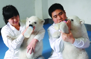 育幼员在给孪生小北极熊人工喂奶(6月9日摄)。