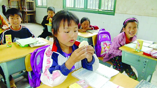 为确保农村每个在校的小学生能吃到放心的营养餐,泸溪县梁家潭乡学区对全乡所有的小学、村片小、村小、村教学点的学生进行仔细摸底登记造册,让孩子们一个不少的享受到“放心营养餐”。图为6月8日,该乡芭蕉坪村小学学生们开心地吃着统一配送的营养餐。 唐正海 舒绍辉 摄