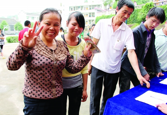 6月13日,花垣县团结中学一位家长替自己的女儿领到了上半年的生活补助费,感到十分开心。当天,花垣县2012年上半年贫困寄宿生生活补助费发放仪式在该校举行,117名贫困寄宿生每人领到了625元的生活补助费。此次,全县共发放补助费256万多元。 龙恩泽 摄