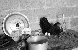 保靖县清水坪镇大坝村田仁忠家,有一只喂养了3年下绿色鸡蛋的母鸡。去年的一天,田仁忠把这只母鸡下的绿色鸡蛋放在餐桌上,被母鸡发现,从此后这只母鸡每天就跑到餐桌上下蛋,成为该村的一大趣事。图为6月15日,这只母鸡正在餐桌上下蛋。 俞采华 陈亚平 摄