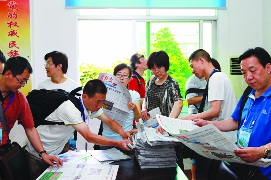 “迎接十八大做好‘科学发展、辉煌成就’主题宣传”的全国新闻媒体编辑记者,在团结报社陈列室兴致勃勃地翻阅《团结报》。 龙清彰 摄