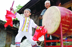 保靖县葫芦镇国家级苗族鼓舞传承人洪富强年近八旬,仍痴迷传授苗族鼓舞。暑期,他组织农村儿童学苗鼓,既传承了苗鼓薪火,又让儿童们度一个欢快的暑假。图为7月12日,洪富强在教儿童打鼓。 向万银 摄