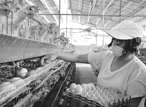 龙山县“羽丰养鸡专业合作社”是一家绿色环保型的蛋鸡场。目前,日产新鲜鸡蛋10万余枚,市场供不应求。图为7月20日,该合作社员工熟练地捡拾新鲜鸡蛋。