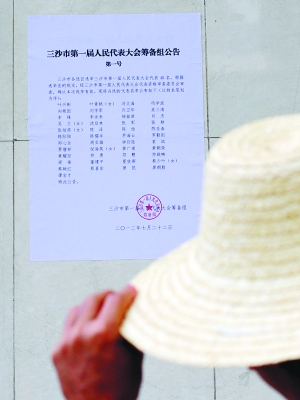 7月22日,一位渔民在西沙永兴岛看张贴的三沙市第一届人民代表大会筹备组第一号公告。