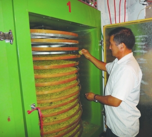 凤凰县乡土科技特派员吴福恩今年引进种植金银花新品种“九丰一号” 280亩,带动腊尔山及周边地区9个乡镇37个村63户农户发展金银花种植,种植面积达1577亩。他组织成立的凤凰县一品金银花农民专业合作社为该地区金银花的种植、养护、加工、销售提供了重要的支持。图为吴福恩正在使用全自动烘烤机烘烤他种植的“四季树形金银花”。 熊文宙 隆海江 摄