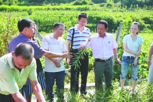 吉首市委统战系统党员干部在开展“学一技、联一户、解一难”活动中,下到田间地头,引导群众发展生姜、西瓜、香瓜等“短、平、快”特色种植项目,使一些村民快速走上了脱贫路。图为7月27日,该系统党员干部在田间实地察看生姜长势。
