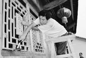 随着农村生活水平的不断提高,农民雕木扎花装修房屋已形成潮流,既传承了非物质文化遗产,又弘扬了民族文化。图为8月6日,保靖县葫芦镇新民村木雕技艺州级传承人向心红,在葫芦村为村民安装木雕花板。