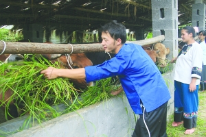 花垣县雅酉镇麻家村龙胜新、龙红丽两兄妹,同为2010年大学本科毕业生。毕业后,兄妹俩把自己所学的知识用于畜牧养殖业上。他们向雅酉信用社贷款15万元购湘西优质黄牛养殖。现已产牛仔85头,收入30多万元,成为大学毕业生创业的榜样。图为8月15日,龙胜新(左一)、龙红丽(右一)在喂养黄牛。