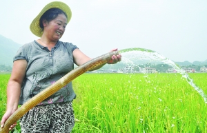 8月16日,龙山县召市镇双进村杨梅香,正在给稻谷抽水抗旱。杨梅香今年种520多亩稻谷,是远近闻名的种粮大户。当前,正是稻谷出穗的时候,该县及时组织群众开展抽水抗旱行动。图为杨梅香正在给稻田灌水。
