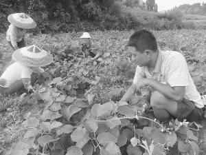 8月27日,永顺县松柏镇村民刘老五(右一),带领帮工为猕猴桃幼苗清除杂草。去年,刘老五在该镇猕猴桃专业合作社的支持下,将4亩旱田改作育苗基地,培育20余万株“红心”、“米良一号”猕猴桃幼苗。目前,幼苗长势喜人,今冬预计收入60多万元。” 向号 摄