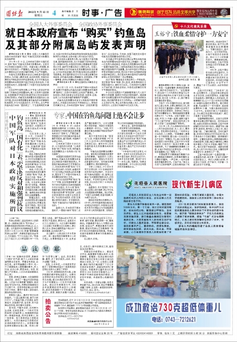钓鱼岛“国有化”表示坚决反对和强烈抗议