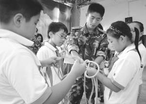 吉大师院附小十分重视校园安全,开学以来,多次邀请安全方面的有关专业人员进校开展安全教育,以此提高师生们的安全意识,为创建平安校园打下坚实的基础。图为消防官兵在教学生们如何使用消防安全绳。