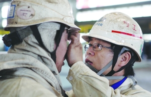 一位工友在焊接过程中眼睛发生不适找洪刚(右)帮忙查看(9月15日摄)。