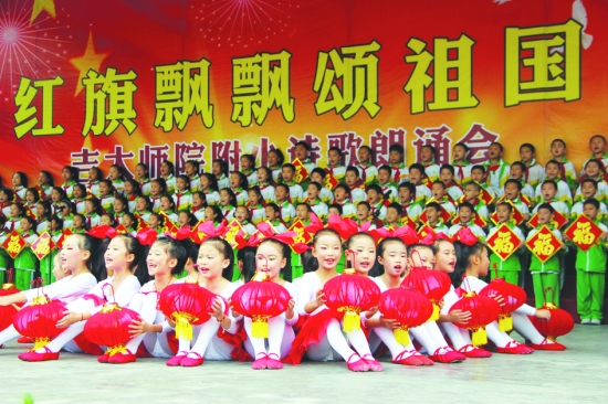 9月28日,吉大师院附小的孩子们在进行红色诗歌朗诵表演。迎接国庆节的到来,该校组织3500多名学生,举行红色经典诗歌朗诵比赛,讴歌党的丰功伟绩和祖国的繁荣昌盛。 彭 彪 摄