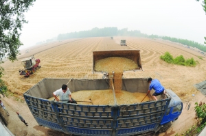 2012年6月5日,河南省沈丘县北杨集乡林寨村农民把收获的小麦直接装上卡车运往粮库。
